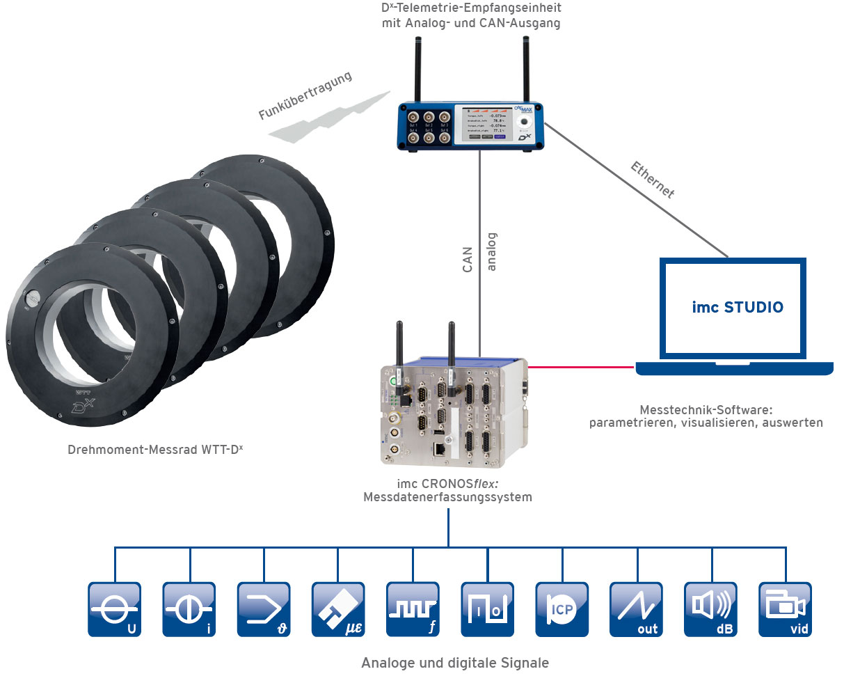 Jedes WTT-Messrad ist mit einer digitalen Sendeeinheit des modularen Dx-Telemetriesystems ausgestattet. Die Messdaten von bis zu vier Drehmoment-Messrädern werden kabellos vom Rad an Empfangsantennen am Außenspiegel übertragen – dank Digitaltechnik störsicher und mit hoher Auflösung. Die in den Rädern integrierte Dx-Sendeeinheiten werden von der Empfangseinheit im Fahrzeug zentral angesteuert und getaktet. Diese hochgradig simultane Abtastung aller vier Räder ermöglicht es, schnelle Regelungsprozesse zwischen den Rädern mit hoher zeitlicher Präzision zu erfassen und zu validieren. Messdaten werden an der Empfangseinheit über CAN oder analog ausgegeben und sind damit leicht in bestehende Messsysteme zu integrieren.
