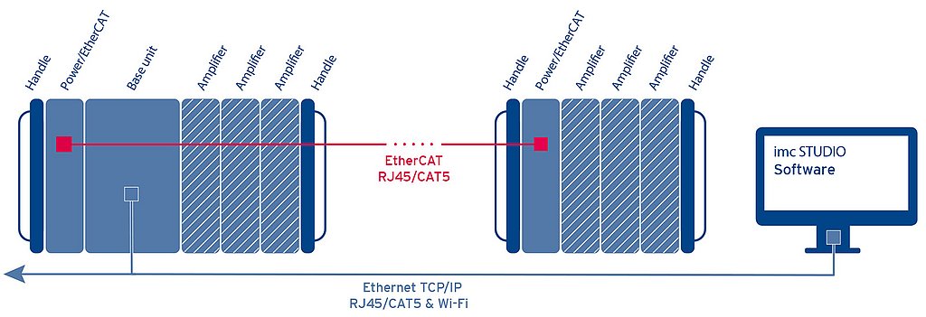 Además de su diseño modular como sistema centralizado, el imc CRONOS-XT también permite su instalación de manera distribuida en el espacio. Esto posibilita que los amplificadores de señal se ubiquen junto al sensor y de esta manera reducir a mínimos la longitud de los delicados y costosos cables de señal. La conexión a redes se efectúa por medio del bus con base de EtherCAT del sistema imc. Todos los datos convergen de forma sincronizada a la unidad central.