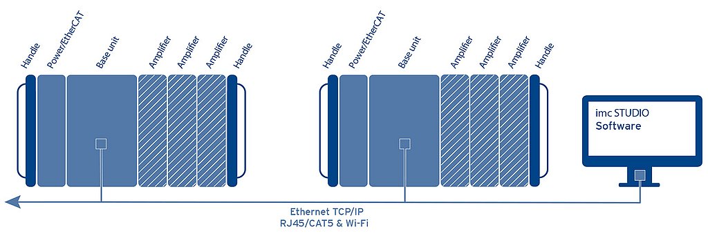 Para mediciones extensas con cientos o incluso miles de canales, varios módulos de imc CRONOS-XT, así como cualquier otro dispositivo de medición de imc, pueden ser operados de forma agrupada como un único sistema. Los sistemas se conectan a la red a través de Ethernet y se sincronizan vía DCF77, IRIG-B, GPS o PTP. Los datos pueden ser almacenados directamente en el dispositivo o transferidos a un PC o NAS por streaming de datos en red.