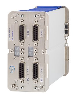 Además del módulo DAC puro, hay un "módulo doble" combinado con 16 salidas digitales adicionales (DO-16-HC). Las salidas digitales proporcionan 16 señales de control aisladas compatibles con el controlador con una mayor capacidad de carga de corriente. Los estados de las señales se pueden crear a través de imc Online FAMOS a partir de una combinación computacional de canales de medición o influenciados por la máquina de disparo.